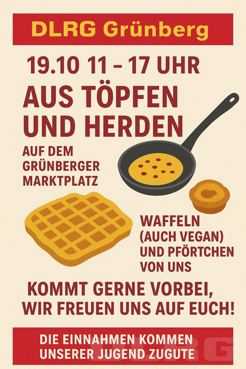 19.10.2025 11 - 17 Uhr "Aus Töpfen und Herden" auf dem Grünberger Marktplatz mit Waffeln (auch vegan) und Pförtchen von uns.
