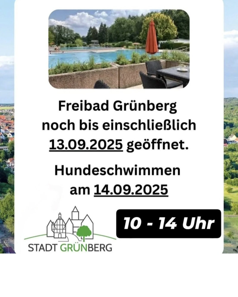Unser Freibad bleibt noch bis einschließlich 13.09.2025 geöffnet - also nutzt die letzten Sommertage! Zum krönenden Abschluss findet wieder das alljährliche Hundeschwimmen statt: